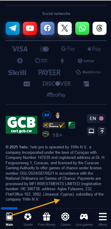 | Operator | 1win N.V. |