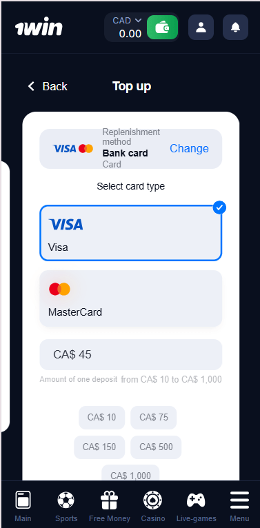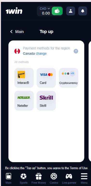To start playing real money games or placing sports bets at 1win, you need to fund your account. Canadian players can make secure and fast deposits using several convenient payment methods. The minimum deposit amount is CA$10. How to deposit at 1win: