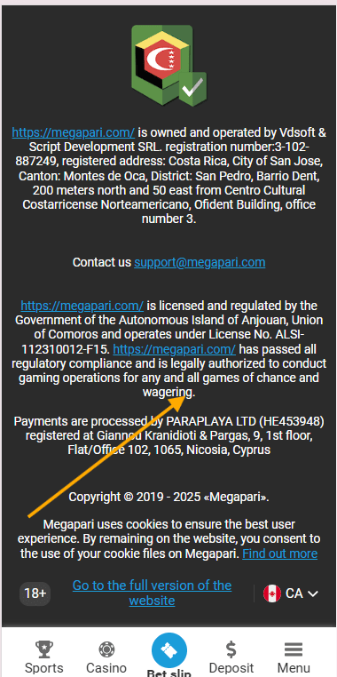 Megapari operates under an international license issued in Anjouan, Comoros (No. 3-102-887249). While this license allows it to provide services to users in Canada, it does not hold a provincial license (e.g., from Ontario). Therefore, Canadian users should be aware they are using a globally licensed platform that is not locally regulated.