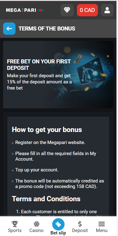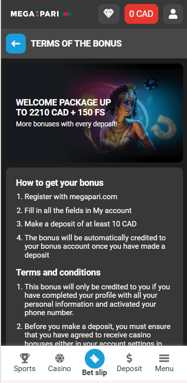 Megapari is a popular platform among Canadian players, operating under an international license from the Comoros Islands. New users can take advantage of three welcome offers: a sports betting bonus of up to 350 CAD, a free bet on the first deposit, and a generous casino package worth up to 2210 CAD plus 150 free spins. This gives every new player the flexibility to choose the best way to get started.