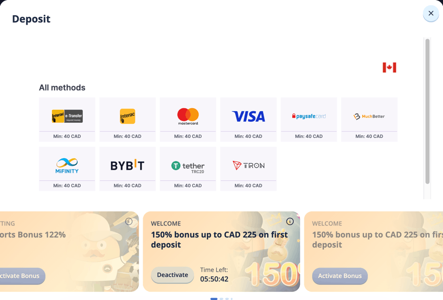 | Payment methods | Interac, Visa, Mastercard, Paysafecard, MuchBetter, Mifinity, Bybit, Tether TRC20, TRON |